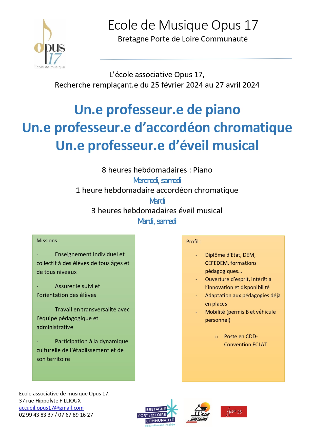 L’École est à la recherche d’un ou une musicienne intervenante pour un remplacement suite à un arrêt maladie, de deux semaines, prolongeable. Dans l’idéal, il s’agit d’un remplacement de 35h, au minimum de 4h (le mercredi) par semaine. Toutes les informations de contact se trouvent sur leur site internet