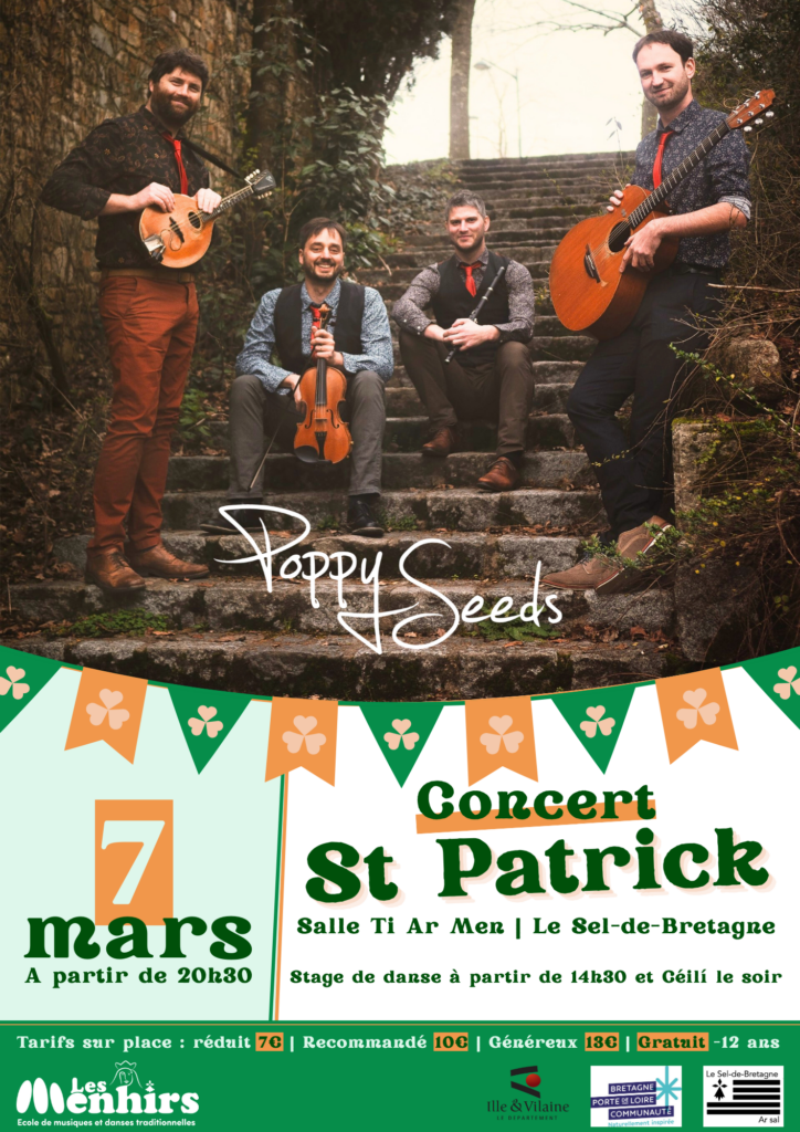 Rendez-vous samedi 7 mars pour la Saint-Patrick au Sel-de-Bretagne avec le groupe Poppy Seeds ! 20h30 : Concert puis Céilí. Tarifs : Réduit 7€ / Recommandé 10€ / Généreux 13€ / Gratuit – 12 ans. Lieu : Salle Ti Ar Men, Le Sel-de-Bretagne.