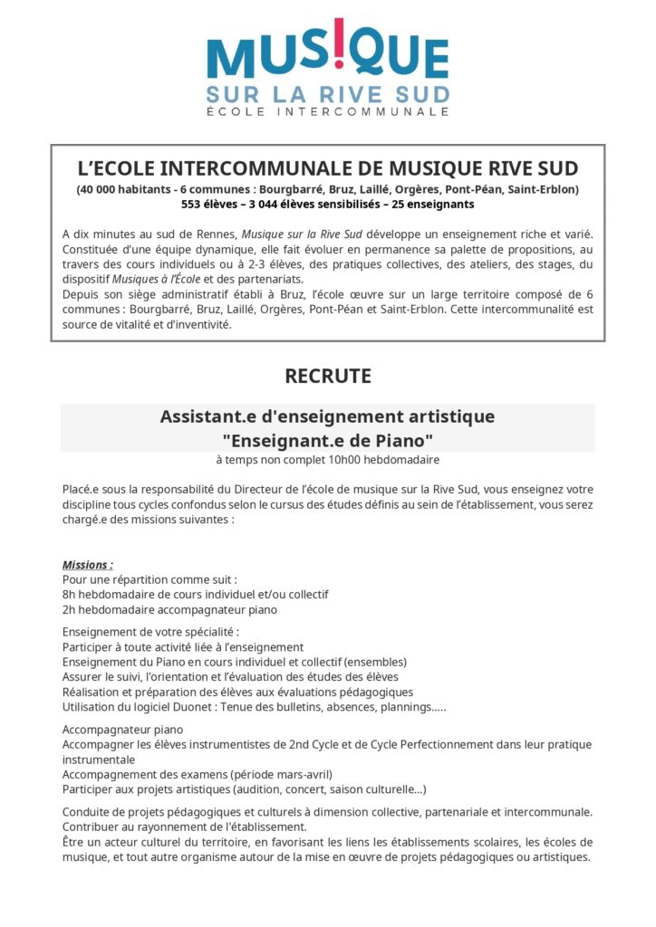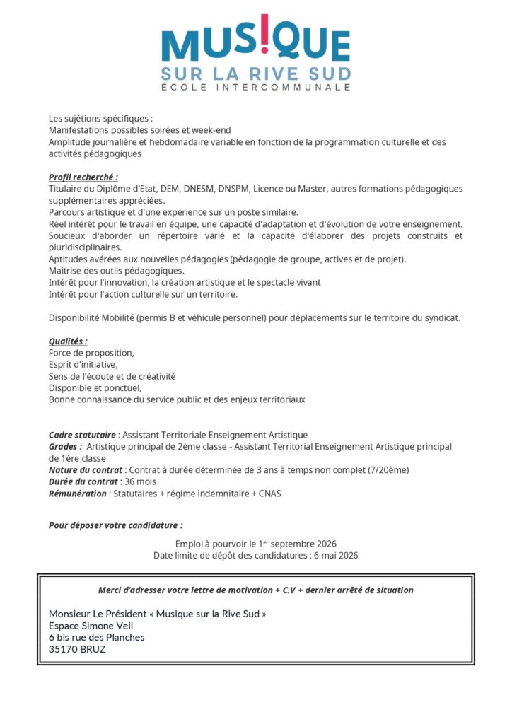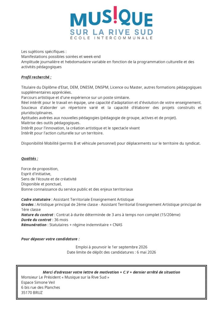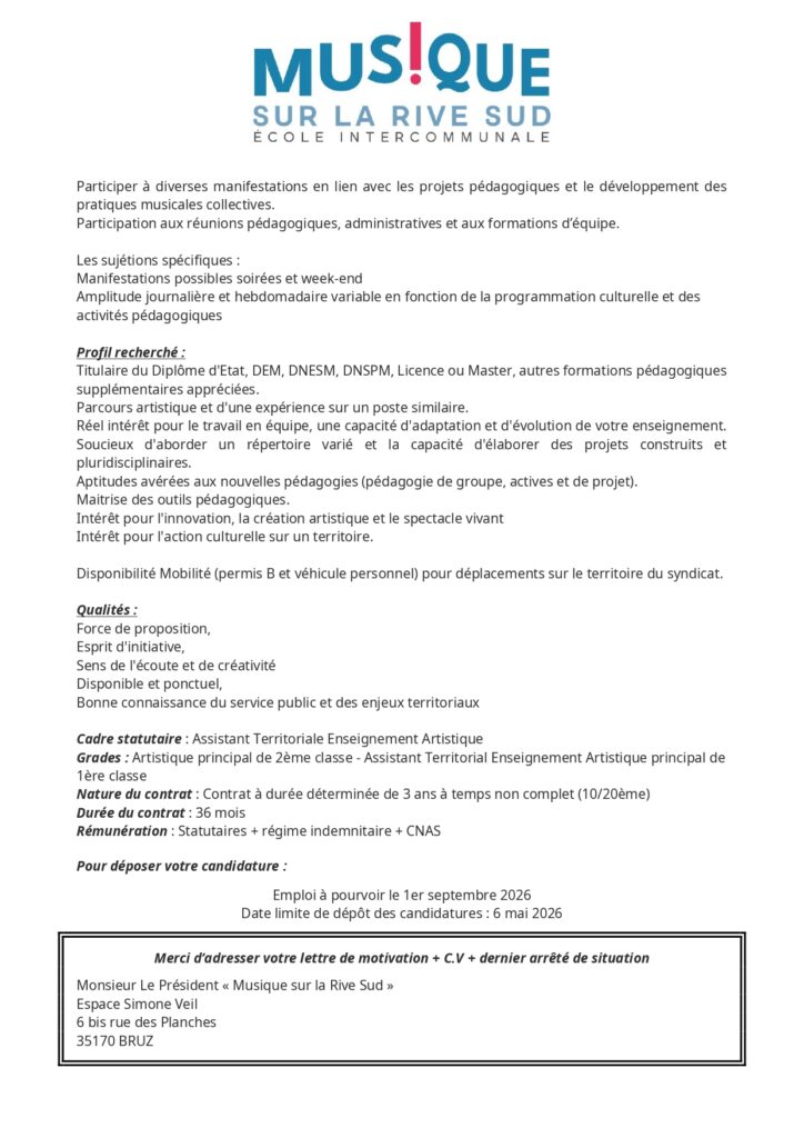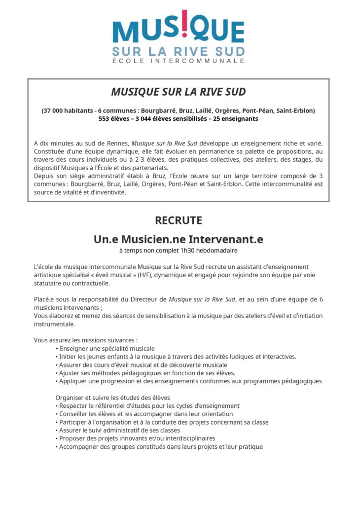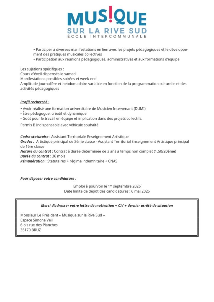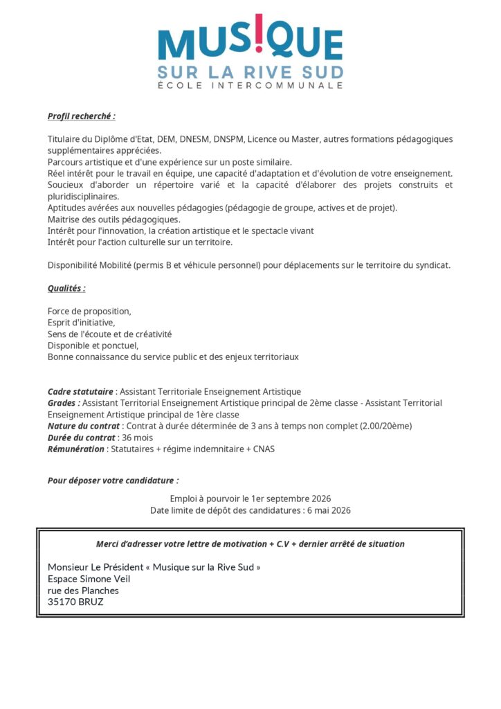 L’École est à la recherche d’un ou une musicienne intervenante pour un remplacement suite à un arrêt maladie, de deux semaines, prolongeable. Dans l’idéal, il s’agit d’un remplacement de 35h, au minimum de 4h (le mercredi) par semaine. Toutes les informations de contact se trouvent sur leur site internet