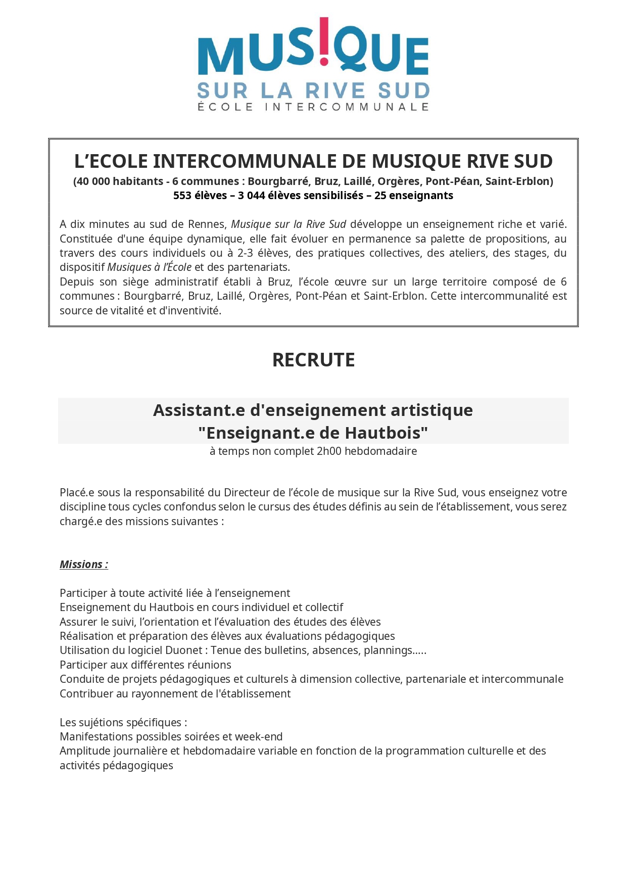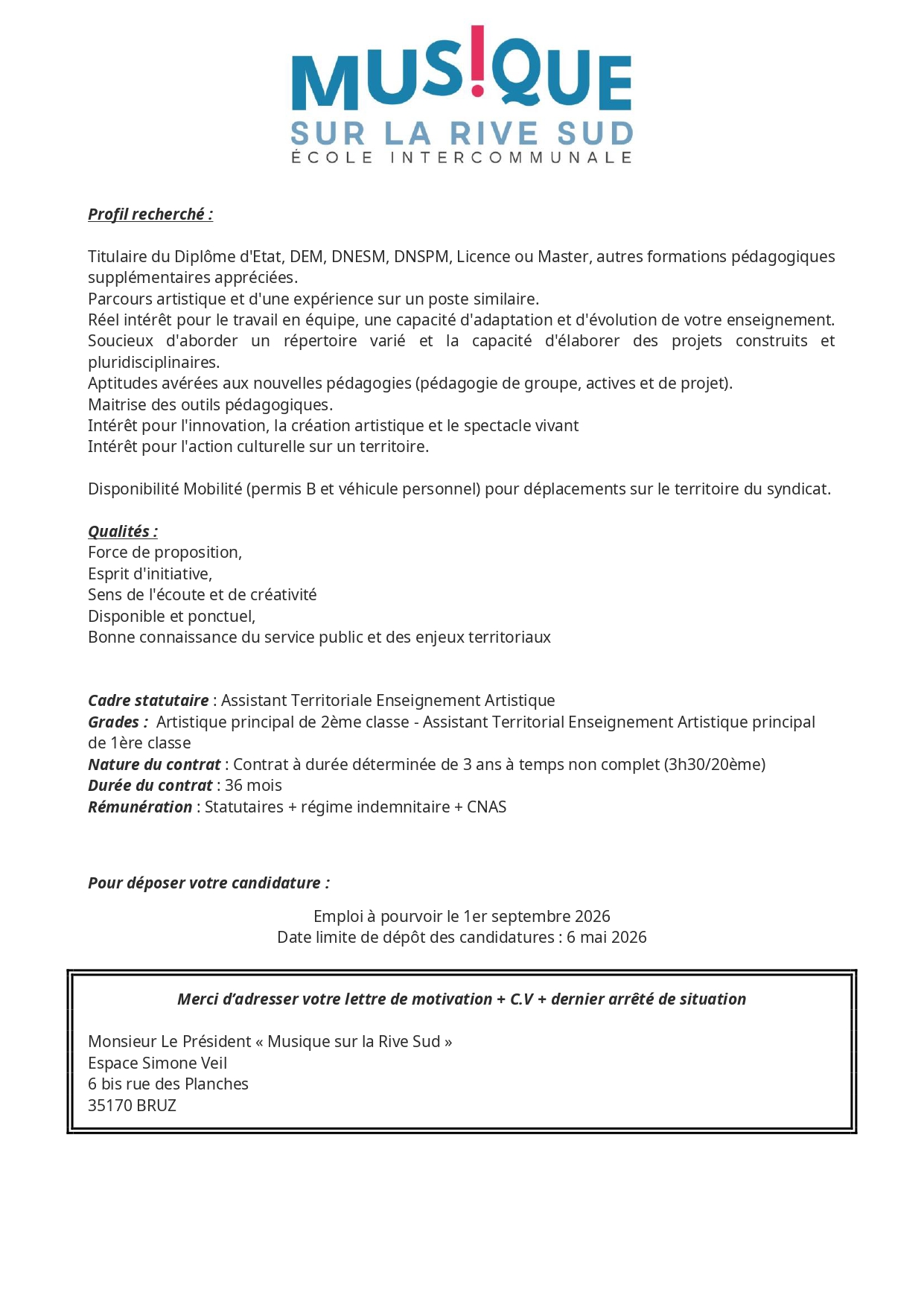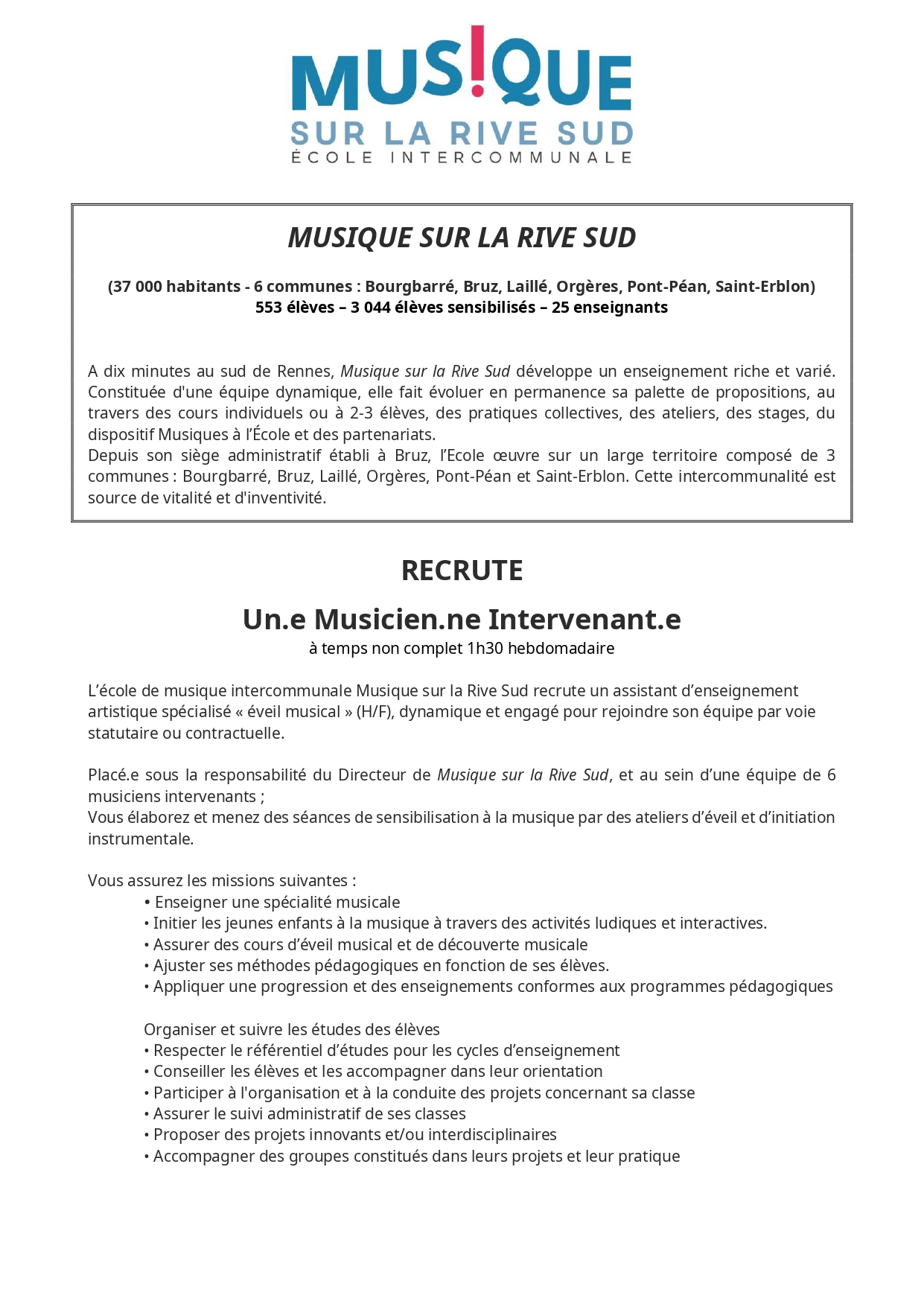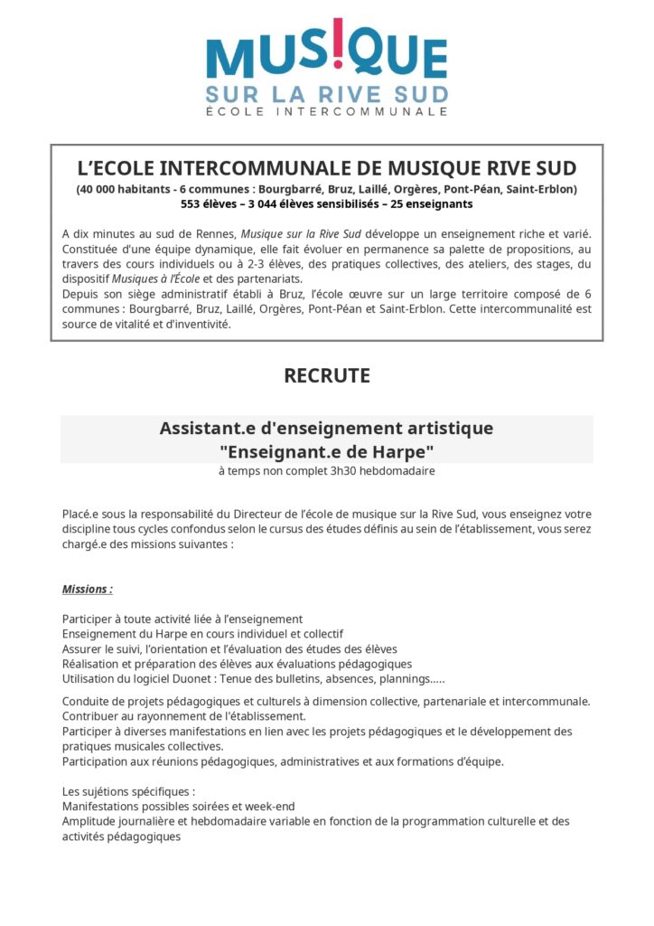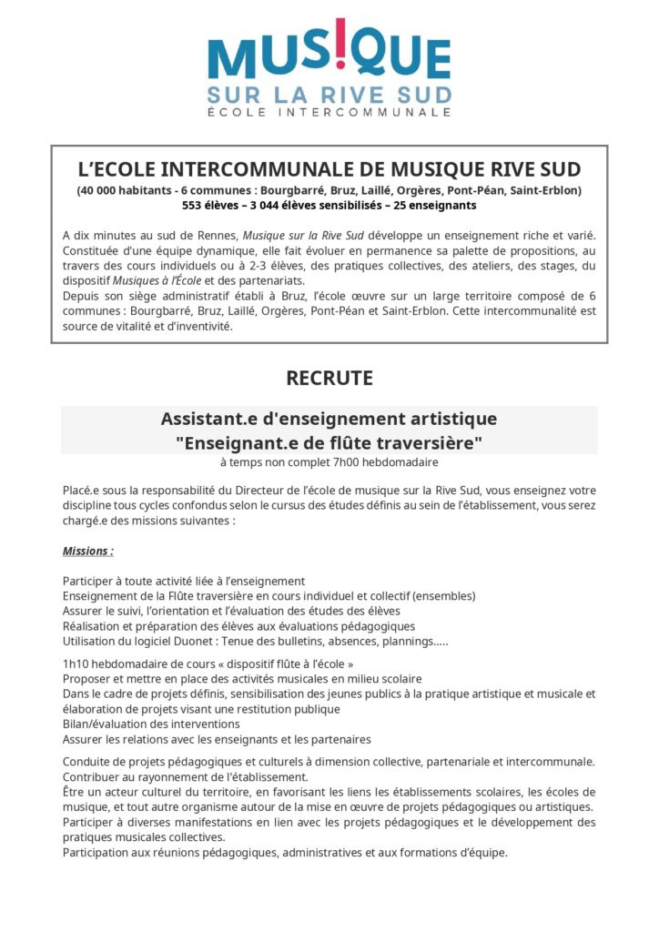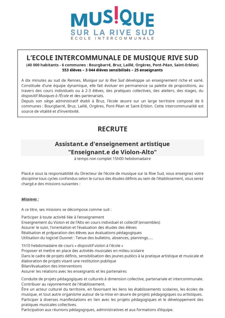 L’École est à la recherche d’un ou une musicienne intervenante pour un remplacement suite à un arrêt maladie, de deux semaines, prolongeable. Dans l’idéal, il s’agit d’un remplacement de 35h, au minimum de 4h (le mercredi) par semaine. Toutes les informations de contact se trouvent sur leur site internet